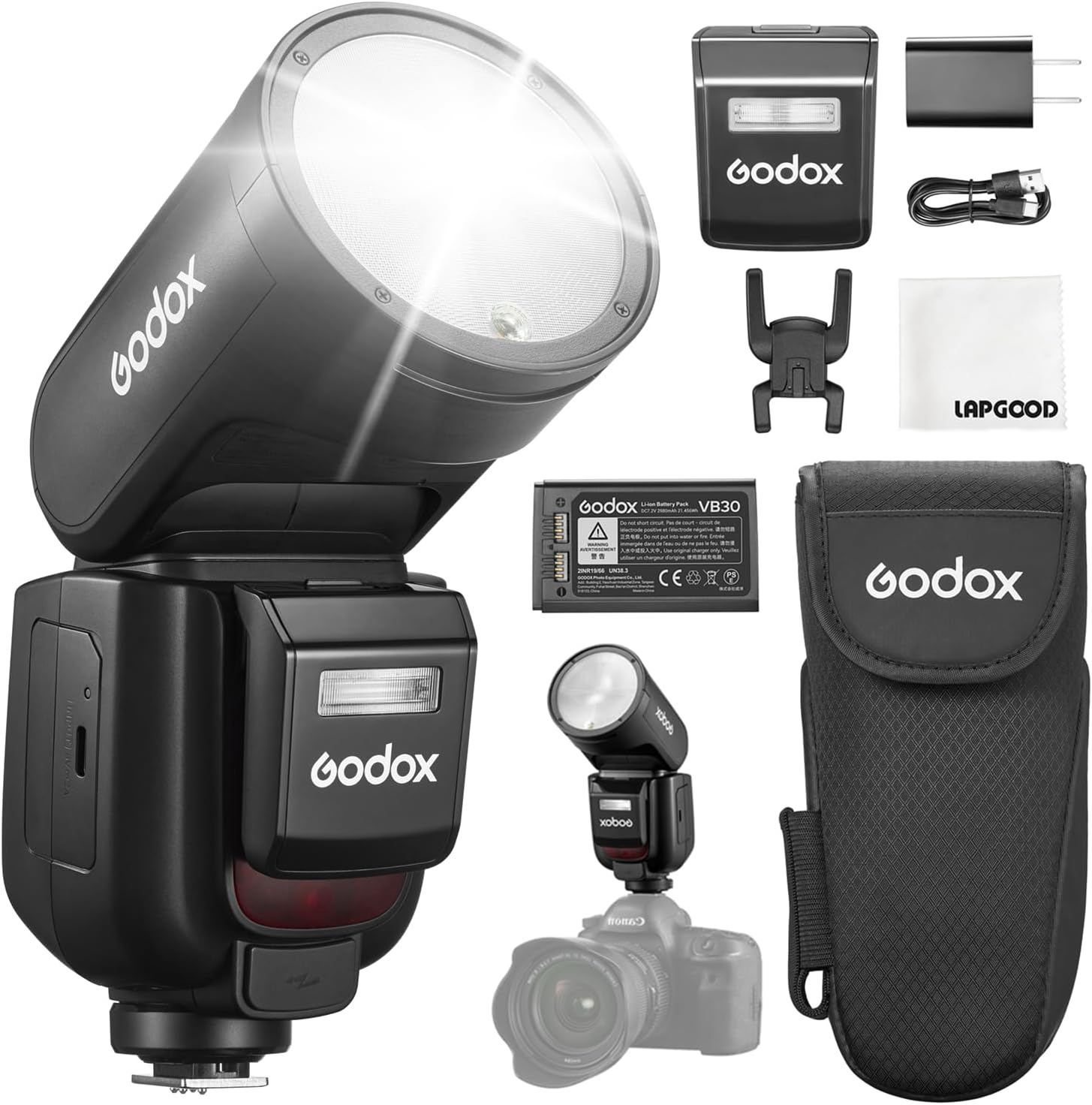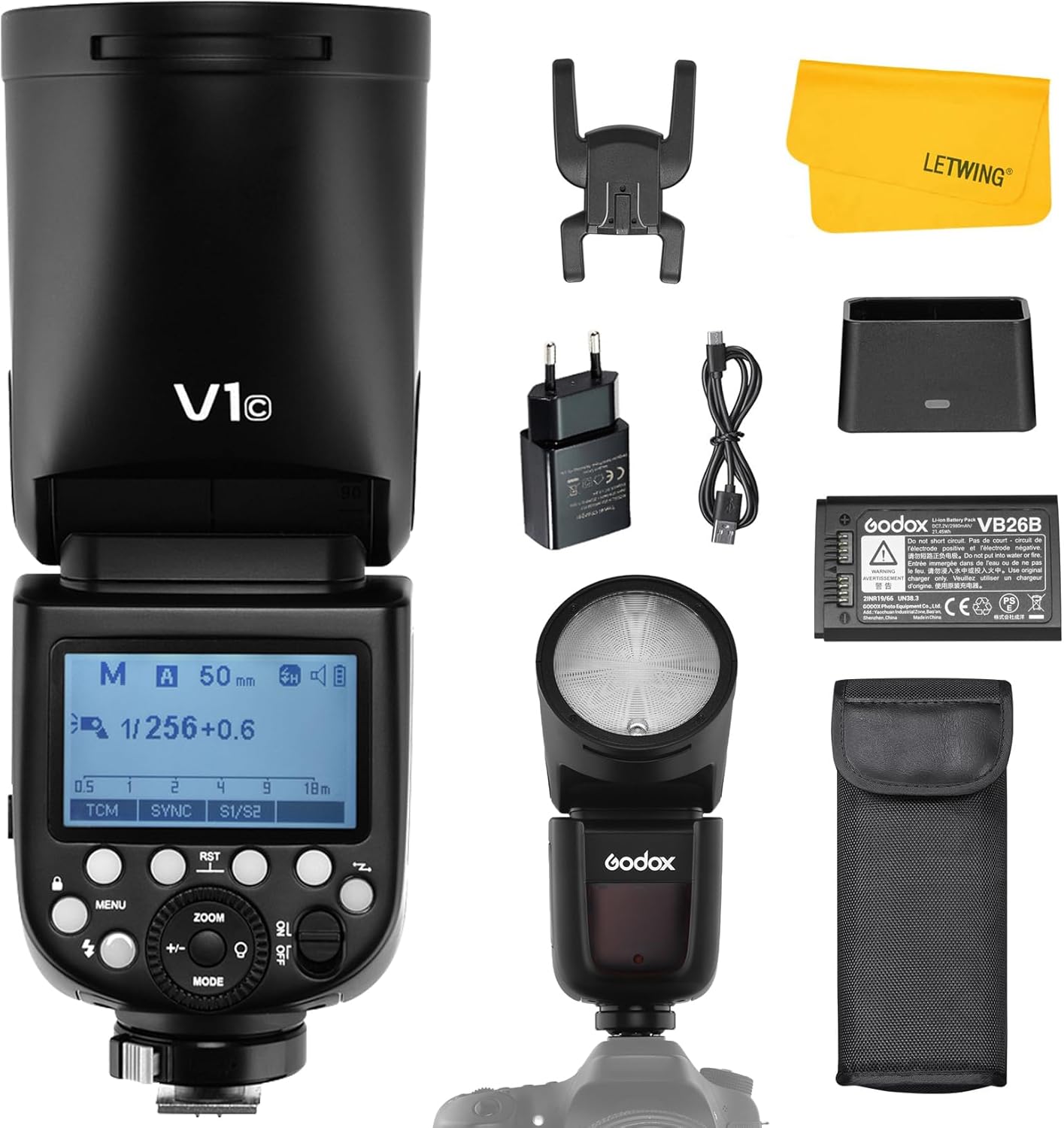 Godox V1C Kit de Flash Redondo para Canon - Flash de Cabeza Redonda para Cámara 2.4G HSS 1/8000S TTL, Tiempo de Reciclaje de 1.5 Segundos, Batería de Litio de 2600 mAh, Lámpara de Modelado LED