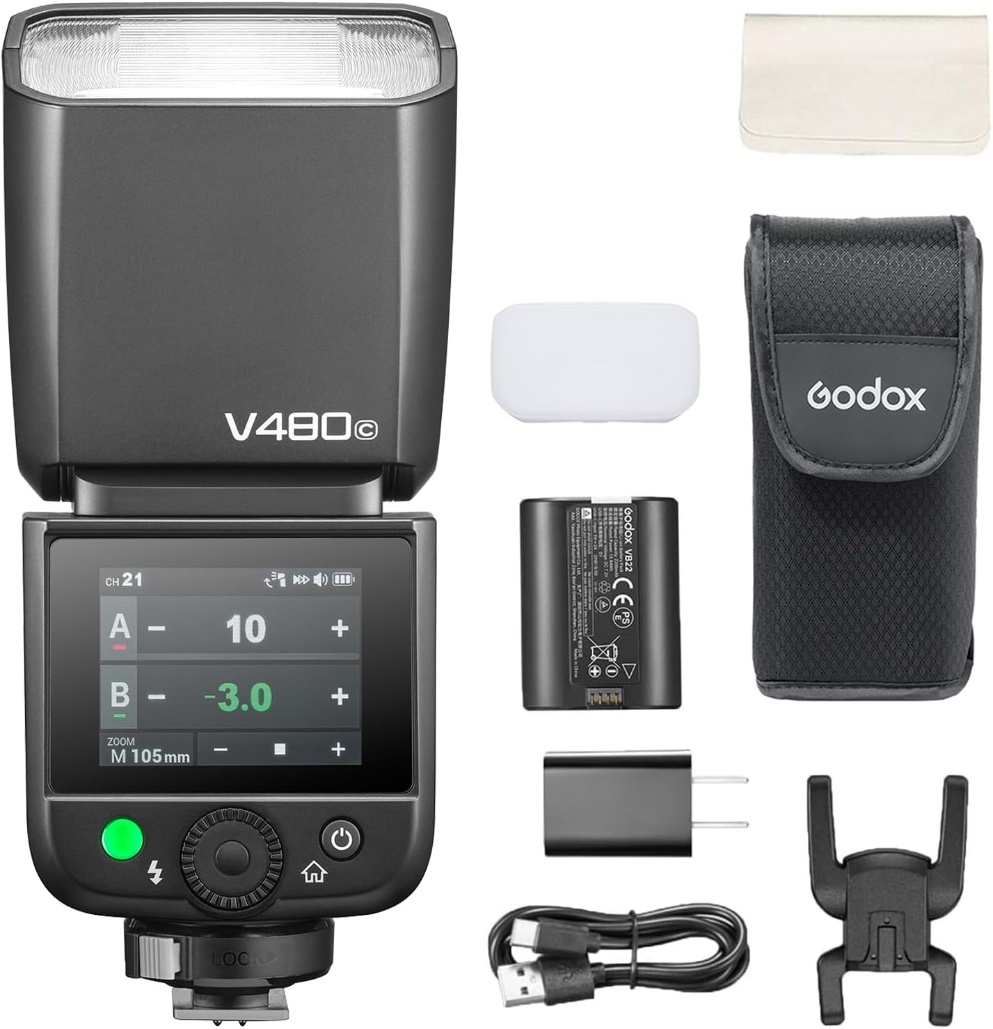 Godox V480-C Flash para Canon, TTL, GN50 de Alta Potencia, Control por Pantalla táctil, Carga USB-C, Tiempo de Reciclado de 1,7s, 650 Destellos de máxima Potencia, 2,4G X inalámbrico, 1/8000s HSS
