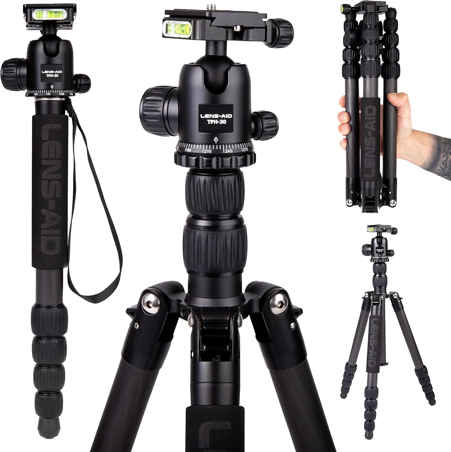 Lens-Aid Trípode de Viaje de Carbono Profesional con Cabezal de Bola – Ligero y Compacto, 4 en 1, Monopié, Trípode Macro para DSLR y sin Espejo