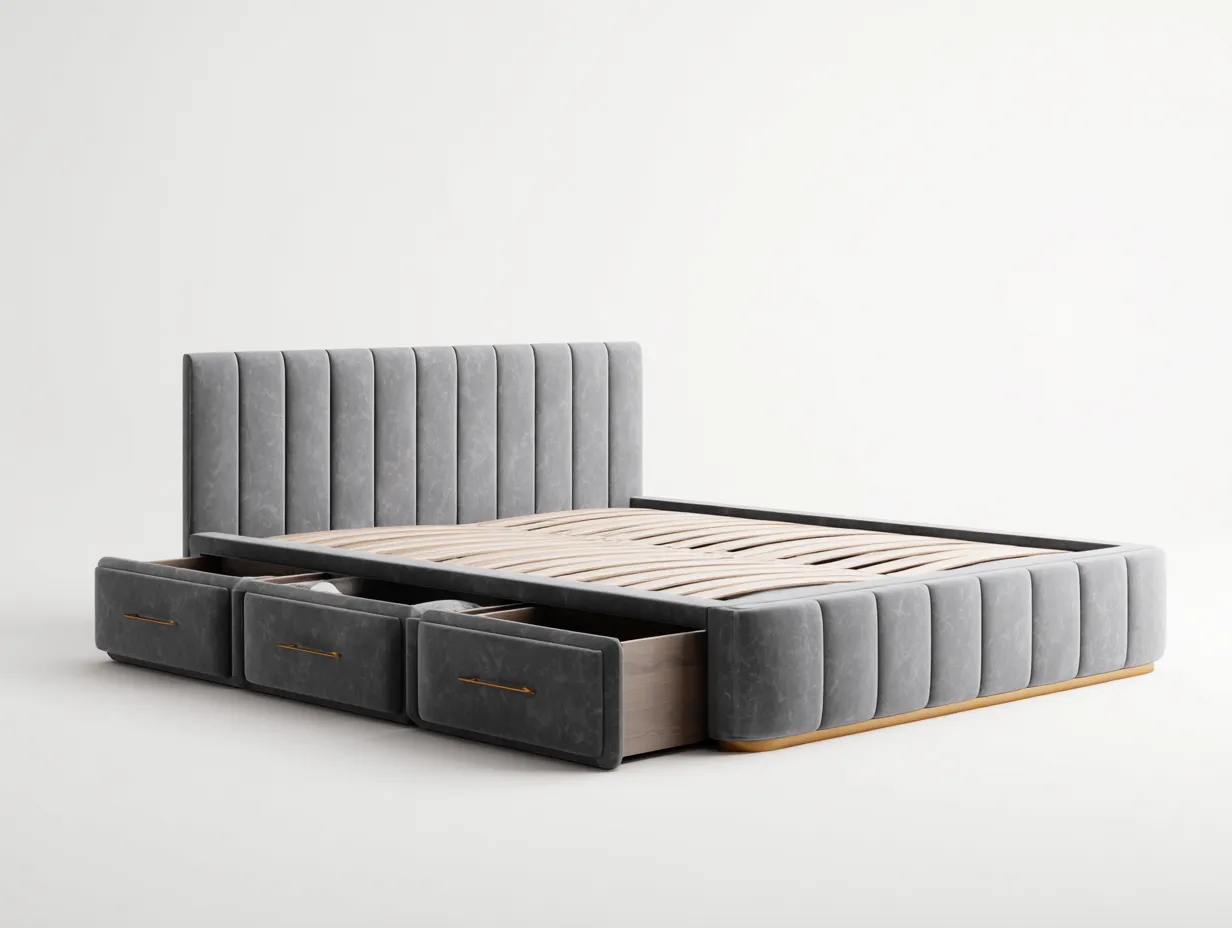 La cama integra espacio de almacenamiento en la base, permitiendo mantener el dormitorio ordenado sin renunciar al diseño. La estructura es estable y adecuada para un uso diario.