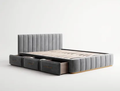 Cama doble para uso en interiores, diseñada específicamente para dormitorios. Incorpora una estructura tapizada con cabecero alto de líneas verticales acolchadas, combinando estética contemporánea y funcionalidad.