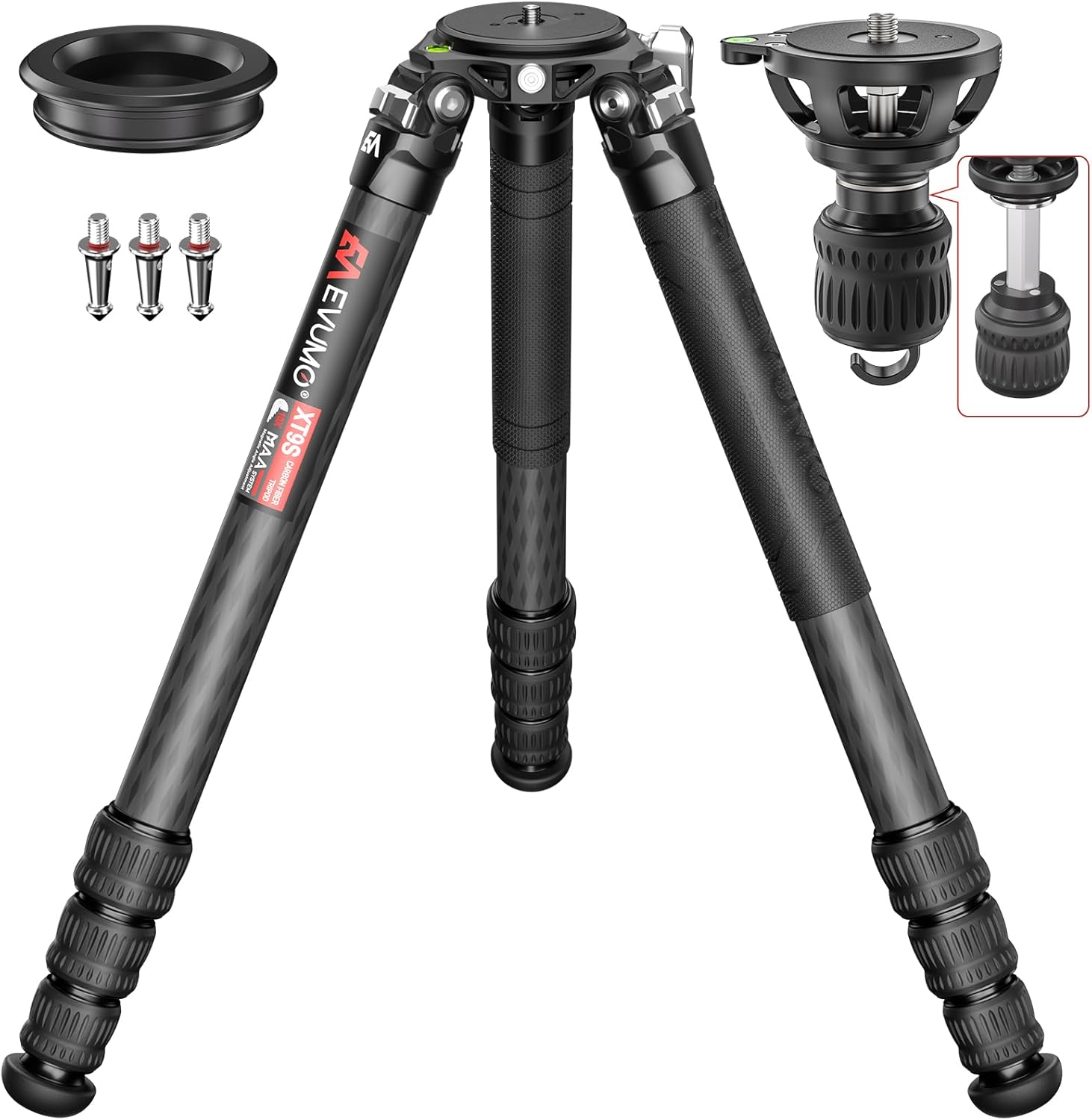 EVUMO Tripode de 165cm, 10x Carbono con Estabilizador Magnético de 75mm, Cenital para DSLR, Fotografía de Viajes, Picos de Acero Inoxidable Extraíbles, Soporta 40kg