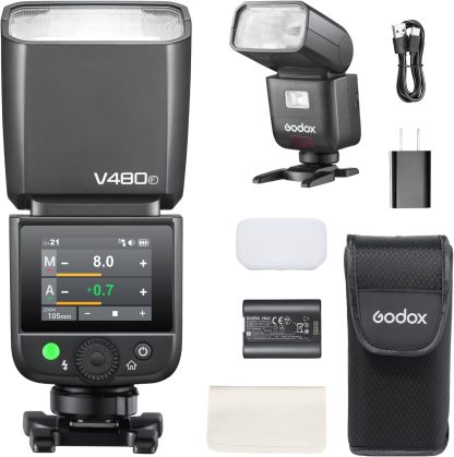 Godox V480-F Flash para Fujifilm, TTL, GN50 de Alta Potencia, Control por Pantalla táctil, Carga USB-C, Tiempo de Reciclado de 1,7s, 650 Destellos de máxima Potencia, 2,4G X inalámbrico, 1/8000s HSS