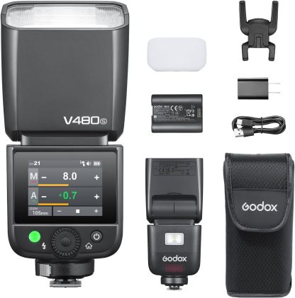 Godox V480-S Flash para Sony, TTL, GN50 de Alta Potencia, Control por Pantalla táctil, Carga USB-C, Tiempo de Reciclado de 1,7s, 650 Destellos de máxima Potencia, 2,4G X inalámbrico, 1/8000s HSS