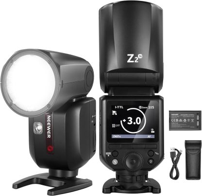NEEWER Z2-N 2.4G TTL Flash Speedlite Cabeza Redonda Compatible con Nikon, Flash HSS 76Ws 1/8000s con UI Mejorada, 2 Lámparas Modelar, Interruptor TTL/M Rapido TCM, Batería 7.2V/3000mAh, Potencia 600