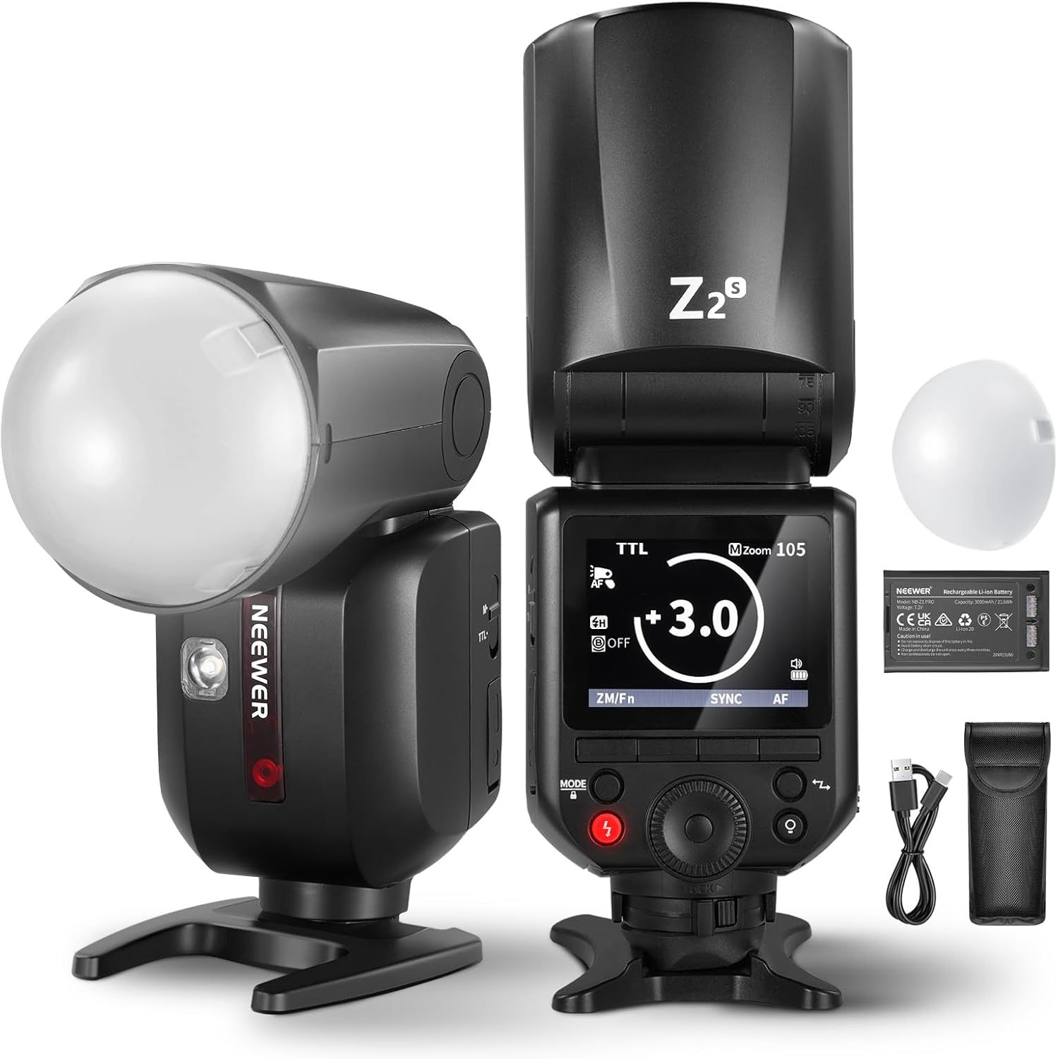 NEEWER Z2-S 2,4 G TTL Flash Cabeza Redonda Flash Speedlite Compatible con cámaras Sony 76 W 1/8000s HSS, difusor 2 lámparas de Modelado Mejor UI TTL/M botón de conmutación 3000 mAh batería 600 Flash